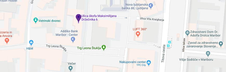 Odvetniška pisarna se nahaja v centru mesta Maribor, le nekaj metrov stran od Trga Leona Štuklja, na zahodni strani Nove KBM in severni strani stavbe častnika Večer. Parkirate lahko na Trgu generala Maistra ali v pokritih garažnih prostorih v trgovsko poslovnem centru City.